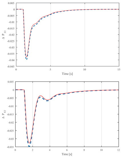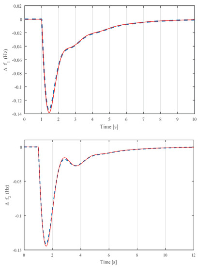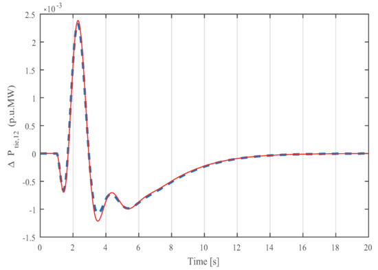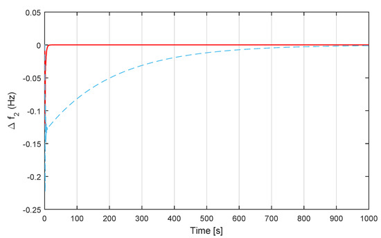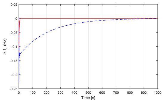 Moreover, due to the parameters of LFC system shown in Table 1 and p.u. MW for , the proposed method is compared with the control law of the paper [10]. Then, the compared results are shown in the following Figure 12, Figure 13 and Figure 14, where the solid lines and dashed lines belong to the proposed method and the control law of paper [10], respectively. It is clear that the convergent speeds of solid lines are faster than the convergent speeds of dashed lines, which implies the advantage of the proposed method.