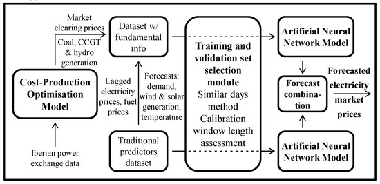 Moreover, another aspect of high importance is how the hybridisation of fundamental and econometric models is performed. The most resorted procedure is, as mentioned previously, obtaining the market clearing prices from the fundamental model, which are later included in the econometric model’s input datasets. However, there are other variables that fundamental models are able to calculate, such as thermal/renewable generation outputs. Therefore, it would be interesting to study the benefits, if any, of incorporating these other variables to said datasets.