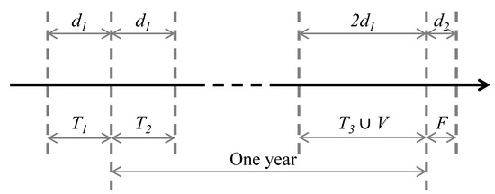 The length of these intervals is a function of one parameter, d1. The first two periods present relevant information pertaining to similar conditions (weather, season, etc.) in the previous year, whereas the third period contains the most recent information. However, contrary to what is usually done on NN forecasting applications, the validation period V is not placed immediately prior to day F, but anywhere within T3′s range according to a similar days method, in a similar manner to what has been carried out in the calibration period selection of [28].