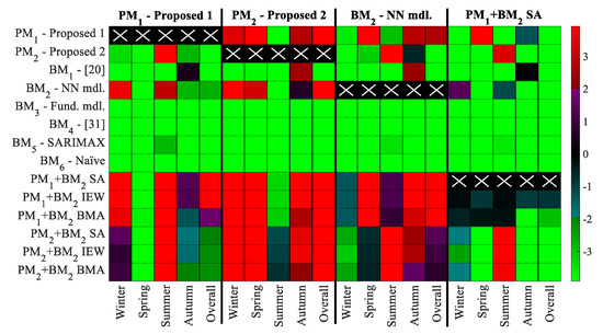 According to Figure 3, model PM1 is the most outperforming model during spring and shows suitable overall performance when considering the entire year 2017. It is also one of the few models not significantly bested by the hybrid model of [20] (i.e., BM1) during autumn. Regarding model PM2, it is not significantly outperformed by any other model during summer, but shows an otherwise slight underachievement when tested against PM1.