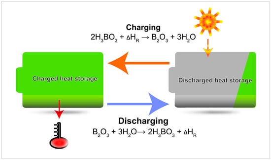 Schematic thermochemical energy storage process illustrated by the boric acid/boron oxide reaction.