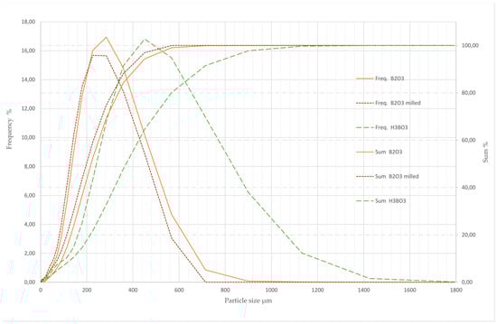 Figure 3 shows the measured particle size distribution (Frequency) and the cumulative frequency (Sum) of the analysed samples. Due to the great hardness of B2O3—in the range of 1.5 GPa for amorphous and ten times higher for the high pressure configuration [32]—no significant effect of milling—whether on particle size nor on distribution—was noticed. The metaboric acid sample apparently consisted of amorphous fragments. Therefore, it was excluded from particle size analyses.