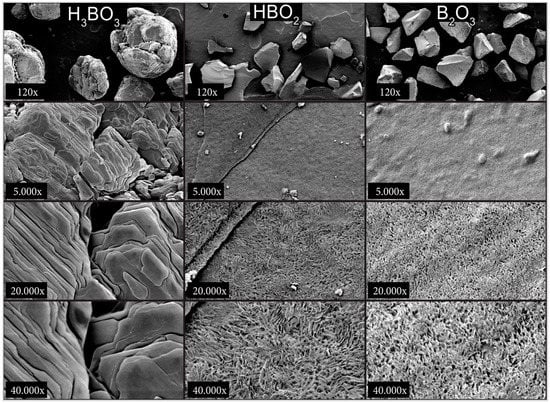 SEM images of H3BO3 (first column), HBO2 (second column) and B2O3 (third column) at different resolutions (lines) of 120×, 5000×, 20,000×, and 40,000× (accelerating voltage: 2.5 kV).