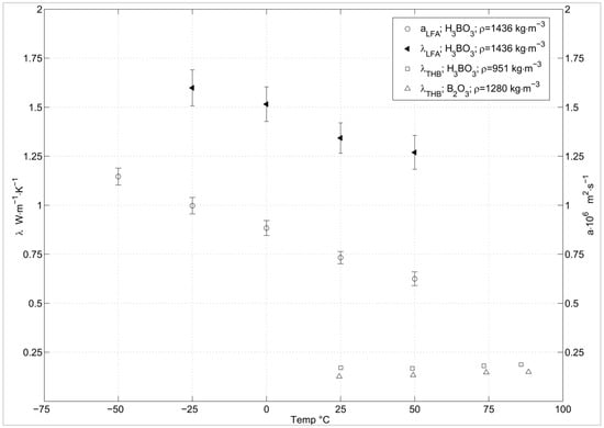 Thermal conductivity (λ) and thermal diffusivity (a × 106) for B2O3 and H3BO3 (pellet and powder) [30].