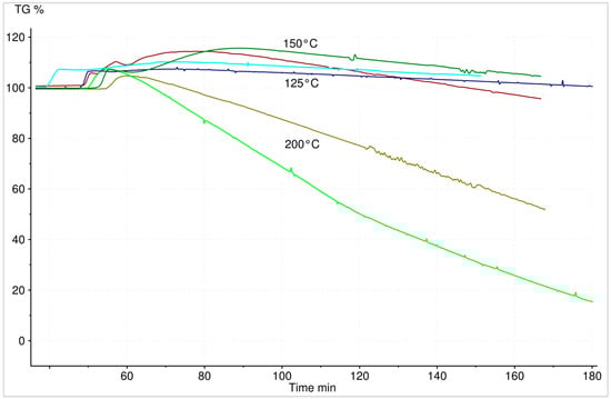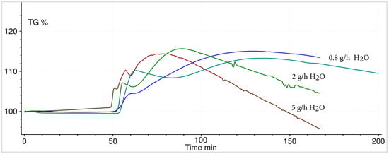 All the experimental examinations of the thermochemical reaction were performed by a simultaneous thermal analysis (STA) device (Netzsch STA449 Jupiter), equipped with a TGA-DSC sample holder. The oven allowed experimental investigations with temperatures ranging from 25 °C to 1250 °C, regulated by an S-Type thermocouple. Mass flow meters (Red-y smart, Voegtlin, Aesch, Switzerland) were used to control the gas flow rate of nitrogen. Aluminium oxide crucibles without lids (Ø = 6 mm, 75 µL) were used for all experiments. Furthermore, nitrogen as inert gas with a flow rate of 100 mL/min was adjusted for each experimental run. Equipped with a steam generator, the instrument allowed thermal investigations under defined moist conditions.