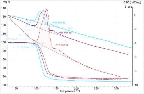 Dehydration (TG and DSC) of 2 mg H3BO3 at different heating rates of 2 (turquoise), 4 (violet), and 8 °C/min (red) with the specific energy content of the reaction (1.3, 1.2, and 1.1 KJ/g).