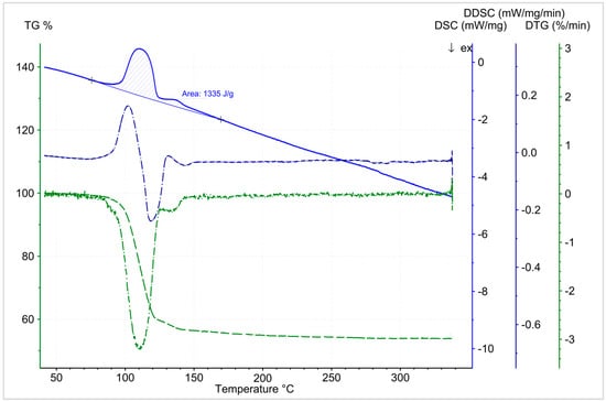 Temperature-dependent dehydration start of 2 mg H3BO3 at a heating rate of 2 °C/min (TG, DSC, DTG, DDSC). Specific energy content of the reaction: 1.3 KJ/g.