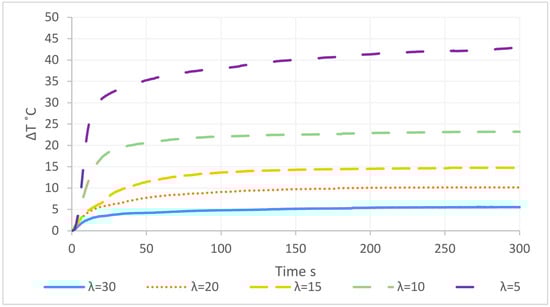 Temperature rise of the hydration reaction depending on different water surplus ratios (λ) with a common initial temperature of 25 °C [35].