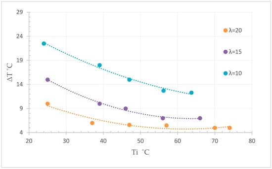 Total temperature rise of the hydration reaction as a function of water surplus λ (20, 15, and 10) and initial temperature Ti [35].