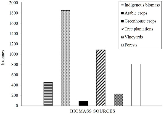 Total biomass potential in the region of Thessaly (in tonnes) by biomass source, 2010 [16,21,22].