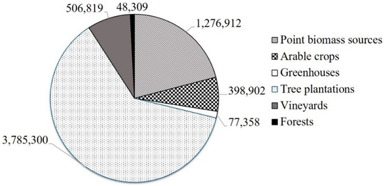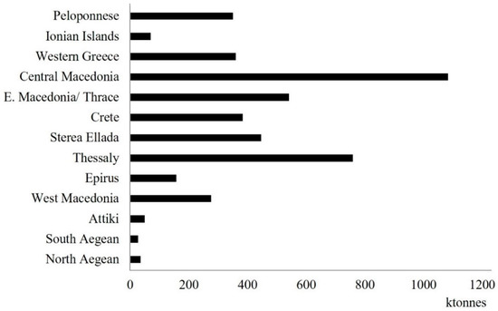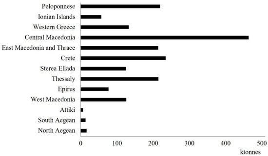 According to estimates by the Ministry of Development (2007), the energy equivalent of the agricultural and forest residues available annually is estimated at 1,000,000 tonnes, while other estimates show that the total available biomass in Greece is about 7,500,000 tonnes of residues of agricultural crops and 2,700,000 tonnes of forest logging residues [42,43,44]. The distribution of annual biomass production, in tonnes, by agricultural waste category in Greece is shown in Figure 3.