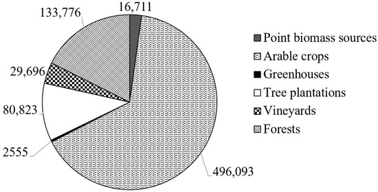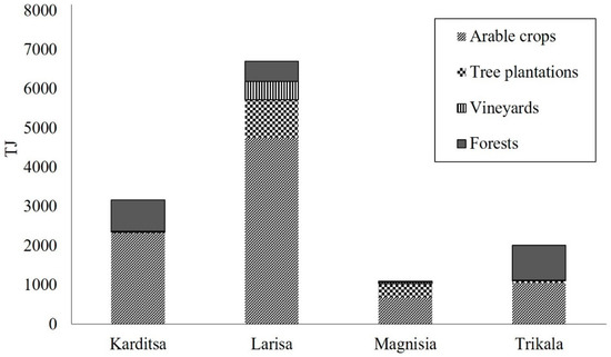 Figure 10 presents the biomass potential by biomass source in the regional unit of Thessaly. In the region of Larisa there is a remarkable biomass potential of arable crops, followed by the regional unit of Karditsa [66]. These results come from the huge agricultural activity in the area.