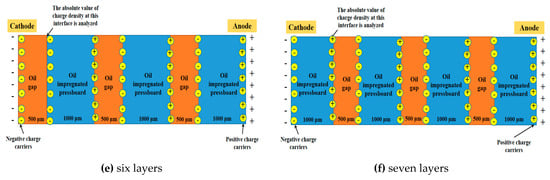 Figure 5. The oil gap thickness is 500 μm, and the oil impregnated insulation pressboard thickness is 1000 μm. The charge density absolute values of the charges accumulated at the first interface adjacent to the cathode for the oil-insulation structure of different layers were analyzed here, as shown in