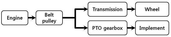 Multi-purpose cultivators (ASC-640, ASIAtech, Daegu, Korea) are generally used as a power source for various operations in the field and in greenhouse farming. The cultivator has a total mass of 93 kg (including the ditching rotor) and overall dimensions of 1530 × 610 × 960 mm (length × width × height). The rated output and the rated torque of the engine of the cultivator were 3.9 kW and 20.7 Nm, respectively, at an engine revolution speed of 1800 rpm. The power transmission efficiency of the belt pulley power transmission system used in this study was generally 95% [14]. Therefore, the rated output and rated torque of the PTO input shaft are 3.7 kW and 19.6 Nm, respectively, considering the power transmission efficiency of the belt pulley. The cultivator was equipped with a manual transmission and a PTO gearbox. The ground speeds of the cultivator at T1, T2, and T3 were 1.3, 1.8, and 4.0 km/h, respectively, and the PTO rotational speeds at P1 and P2 were 335 and 709 rpm, respectively. Figure 1 shows the power flow of the cultivator used in the study. The power from the engine is divided between the transmission and the PTO through the belt pulley. The transmission drives two wheels, and the PTO performs various operations such as rotary ditching, ridging, soil covering, ridge plowing, cultivation, and so on.