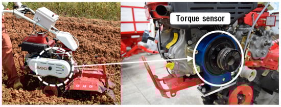 A torque measurement system for the cultivator was constructed using torque sensors (T27 Hollow Flange, Interface Inc., Scottsdale, AZ, USA) to measure the PTO shaft torque as shown in Figure 2, and a measurement device (NI USB-6212, National Instruments) was used to acquire sensor signals. It was difficult to directly measure the load of the PTO shaft directly, because the PTO input shaft was connected to the engine by a belt pulley. The PTO output shaft was connected to the rotary ditching implement to deliver power. The transmission shaft and the PTO input shaft were coaxial. To determine the PTO torque, measured engine torque was used together with the overall reduction gear ratios of the transmission (T1: 0.012, T2: 0.016) and PTO (P1: 0.124, P2: 0.263). Data acquisition software was developed using LabVIEW (Version 2011, National Instruments). One-way ANOVA with gear setting and Duncan’s multiple range tests at a significance level of 0.05 were used to analyze the measured torque. SAS (version 9.4, SAS Institute, Cary, NC, USA) was used for the statistical analysis.