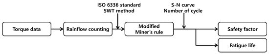 Measured torque data in the agricultural field generally fluctuates [21]. Therefore, simplifying the measured torque data using the cycle counting method is required to determine the PTO gear stress and fatigue life. The rainflow cycle counting method is commonly considered to be the best cycle counting method for estimating fatigue damage. It is regarded as a good procedure for determining damaging events in randomly fluctuating loading conditions [22]. It can convert the measured torque data from the time domain to the frequency domain (ASTM, 1985) [23]. This will separate the individual simple stress cycles from complex irregular load history [24]. Mean torque can significantly affect the fatigue life of the PTO gear-train. Therefore, the effects of mean torque must be considered. Figure 4 shows the computation process for the safety factor and fatigue life of the PTO gear-train.