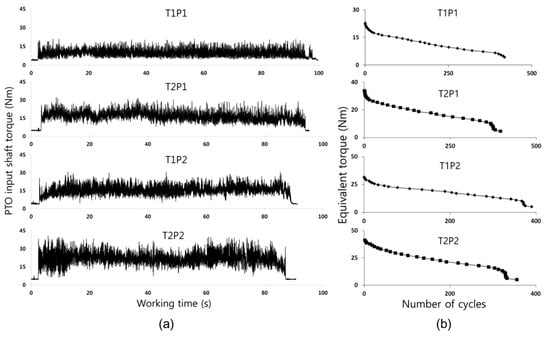 Figure 5a shows the PTO torque at two ground speeds (T1 and T2) and two PTO rotational speeds (P1 and P2). The measured PTO torque shows irregular fluctuations during the rotary ditching operation. The PTO torque increased when the ground speed with the same PTO rotational speed increased. Also, the PTO torque increased when the PTO speed with the same ground speed increased. Figure 5b shows the load spectrum, which is used to analyze the load characteristics under soil and work conditions; it was constructed using the rainflow cycle counting and SWT methods. The maximum equivalent torque for speed combinations of T1P1, T2P1, T1P2, and T2P2 were measured as 22.8, 31.7, 33.9, and 41.3, respectively. When the ground speed increased, the equivalent torque on the PTO was increased. Also, when the PTO speed increased, the equivalent torque on the PTO was increased. The greatest equivalent torque was found at T2P2. The equivalent torque for speed combinations of T1P1, T2P1, T1P2, and T2P2 were similar in the high cycle region from 350 to 400. Relatively low equivalent torque can occur similarly regardless of ground speed and PTO rotational speed. Therefore, as the number of cycles increases, the equivalent torque tends to decrease. The load spectrum was used on KISSsoft for analysis of the PTO gears. The average torque for speed combinations of T1P1, T2P1, T1P2, and T2P2 were 9.87, 16.32, 15.09, and 20.84 Nm, respectively. The average measured torque ratio of each gear combination was 50.1% (T1P1), 82.9% (T2P1), 76.7% (T1P2), and 105.9% (T2P2), respectively, compared with the rated torque of the PTO input shaft of 19.6 Nm. The maximum torque on the PTO shaft for speed combinations of T1P1, T2P1, T1P2, and T2P2 were 21.02, 32.11, 30.61, and 40.79 Nm, respectively. The average torque increased by 38–65% when the ground speed increased by 39% as the transmission gear was shifted from T1 to T2 at the same PTO gear stage. At the same transmission gear stage, the average torque increased by 28–53% when the PTO rotational speed increased by 112% as the PTO gear-train was shifted from P1 to P2. The results show that the PTO torque increased as the ground speed and PTO rotational speed increased. The maximum PTO torque was at the highest speed combination with the transmission set to T2 and the PTO gear set to P2.