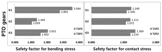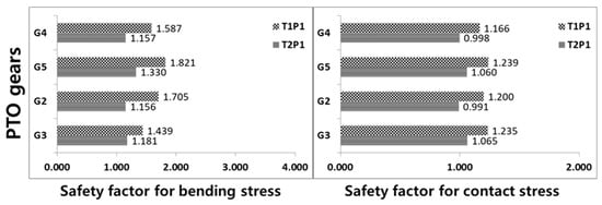 The strength of the PTO gears was evaluated in terms of contact stress and bending stress by calculating the safety factors during a rotary ditching operation. The safety factors for bending stress and contact stress are presented in Figure 6 and Figure 7. These results show that all safety factors for bending stress were higher than the minimum safety factor of 1.0, with the lowest safety factor (1.059) in the gear G2 for the T2P2 gear stage and the highest safety factor (3.584) in the G1 gear for the T1P2 gear stage. However, the safety factor for contact stresses of the G4 (0.998) and G2 (0.991) gears in the T2P1 gear stage were lower than the minimum safety factor of ‘1.0’. In general, the torque tends to increase as the combination of the transmission and the PTO gear is higher [32]. The overall simulation results of the safety factors show that the higher the combination of transmission and PTO gear stage, the lower the safety factor tended to be. However, the results of the safety factor of the G2 and G3 gears have no general tendency for the safety factor to decrease with higher PTO gear stages. It is considered that the safety factor of the G3 gear at P2 is increased because the reduction ratio of P2 (G1-G2-G3) is smaller than that of P1 (G4-G5-G2-G3). In addition, when the PTO gear shifts from P1 to P2, the safety factor of the G2 gear is greatly reduced. This seems to be due to the fact that the G2 gear is the only gear in the P2 gear stage that transmits power at the positions where the gears are in contact with both sides. The safety factor of contact stress had a lower tendency than the safety factor of the bending stress. Based on these results of the safety factors, the T2P1 gear stage (G4 and G2) is considered to be a weak combination of the transmission and PTO gear stage. Therefore, the T2P1 gear stage must be redesigned through the modification of the PTO gear train elements so that the safety factor for bending stress is higher than the minimum safety factor. In particular, the design modification of G2 and G4 gears in T2P1 should be considered.