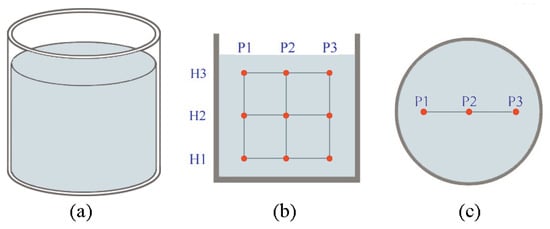 (a) Animal fat in the cylindrical sample holder, and thermocouples positioning within the sample in (b) a vertical section at , and (c) a horizontal section at z = H2.