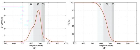 Thermal decomposition process of the animal fat sample at 5 K·min: (a) differential thermogravimetric (DTG) curve, and (b) thermogravimetric (TG) curve.