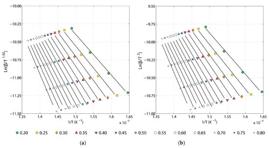 In this section, results for the kinetic decomposition of the animal fat during its oxidation process carried out using Starink and Miura-Maki models are presented. Both these models were applied considering a conversion degree () between 20% and 80%, with a 5% step, according to the ICTAC recommendations []. This particular range allows us to obtain more accurate kinetic data avoiding multiple reactions, and excessive experimental errors that could affect the data below the lower and above the upper selected limits, respectively.
