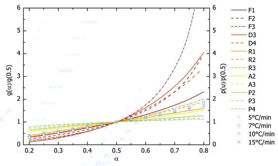 Finally, the theoretical, g()/g(0.5), and the experimental, p(u)/p(0.5), master plots are plotted as a function of conversion rate and used to define the most suitable kinetic model, which for a single step decomposition process with a constant expression, was shown to be associated with a relatively high degree of certainty [].