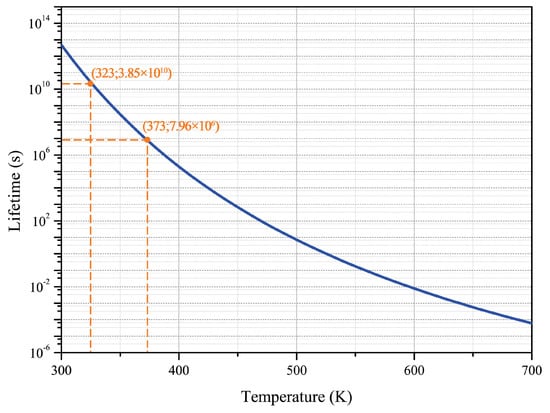 The lifetime, t, is defined to be when the conversion rate is equal to 5%. Figure 5 shows the logarithmic curve of lifetime versus temperature for animal fat. Based on the calculation shown above, the lifetime of animal fat at 323 K and 373 K is equal to about 3.85 × 10 and 7.96 × 10 years, respectively. Consequently, the animal fat has the potential to be used as PCM for a very long time without failure.