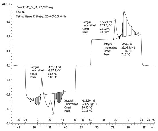 As can be seen in Figure 6, results from the DSC analysis carried out on the animal fat detect two different peaks both during the melting and the freezing process. This is a consequence of the unique chemical composition of the bio-based PCM, which blends in its matrix different kinds of fatty acids, and in particular saturated and monounsaturated fatty acids. The first melting peak is observed at about 2 C, i.e., 275.03 K, while the second one at about 25 C, i.e., 298.30 K. As for the solidification process, it is associated with a first peak at about 21 C, i.e., 274.24 K, and a second one at 7 C, i.e., 280.33 K. In both cases, the melting and freezing peaks defined through the differential analysis are not very clear and cover a wide temperature range, so the obtained peak value can be considered as an average reference value for the transition processes.