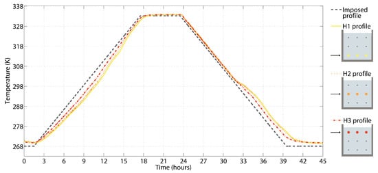 Results from the continuous monitoring of the bio-based PCM during the imposed hygrothermal profile are reported in Figure 7, where the dashed line represents the temperature profile imposed by the chamber, and the other ones, i.e., the solid yellow, the dot orange and the dash-dot red line, show the average thermal response of the animal fat at the bottom (H1), medium (H2) and top (H3) nodes of the monitoring grid, respectively. As can be seen, the bio-PCM follows the imposed forcing conditions fairly regularly; however, the thermocouples in the upper part of the sample seem to be more rapidly affected by the cycle, and more closely follow the reference dashed line. This is because, without the glass layer, the free surface of the PCM directly exchanges heat mainly via convection and conduction with the surrounding air volume, and so, the rate of heat exchanged by the PCM is generally higher in this part of its volume.
