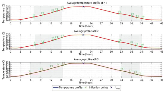 Maxima and inflection points of the three average temperature trends at H1 = 1 cm, H2 = 3.5 cm and H3 = 6 cm.