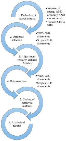 This bibliometric analysis followed the following steps (Figure 1). First, the search criteria, keywords, and period were defined. In this work, we have chosen the words “energy”, “environment”, and “economy”. The reason why these words have been chosen lies with the scientific community’s continued use of 3E terminology to name the development and growth models in which these elements are integrated [1,2,58]. The study period corresponds to the 21st century: from 2001 to 2018 so that new trends can be better defined. Subsequently, Scopus and WoS were the chosen databases in which the analysis was conducted, since they are the two largest databases that follow a rigorous protocol for the inclusion of research work in order to ensure scientific quality [59].