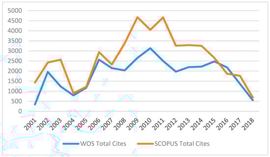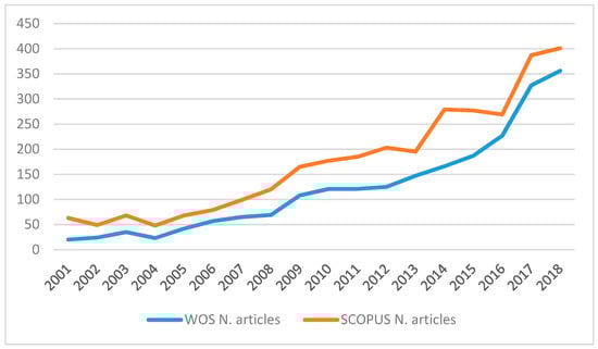 With consideration of the total number of articles in both databases, the trend is positive, exponentially growing in recent years, and even surpassing 400 articles published in 2018 on the Scopus database. The dynamics of WoS with respect to this issue is positive throughout the period, only decreasing in 2004. The Scopus trend, on the other hand, shows several moments of decreasing scientific contribution: in 2004, 2013, 2014, 2015, and 2016. However, the overall positive evolution of this factor indicates that research into the interrelationship between the economy, energy, and the environment is a safe bet, and currently at a high point in terms of the number of studies being published on this issue (Figure 2 and Figure 3).