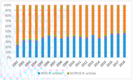 The analysis of knowledge areas has been carried out with an initial homogenization of the existing categories in WoS and Scopus, in order to extract more conclusive results. The adaptation of the categories in WoS has been conducted with the inclusion of the Environmental, Chemical, Civil, Industrial, and Agricultural Engineering subsections, while Computer Science includes Artificial Intelligence, Interdisciplinary Applications, Software Engineering, and Information Systems. The rest of the thematic areas correspond to the distribution that is presented in Table 7. The revision of categories in Scopus has required the inclusion of Chemical Engineering in the Engineering area, while the rest of categories correspond to those existing in this database.