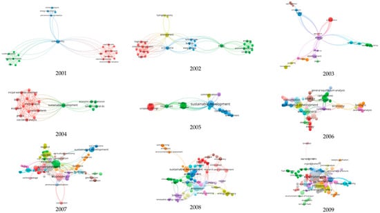 The articles published during 2001 are distributed into three clusters, with the term Sustainability linking them (Figure 5). The first cluster includes: cost effectiveness, Czech Republic, environmental assessment, water, and national accounting; the second cluster: construction materials, governance, developing countries, public policy, and technology transfer; and, the third one: environmental protection, energy consumption, and transport policy, all being within the geographical scope of the Czech Republic and China.