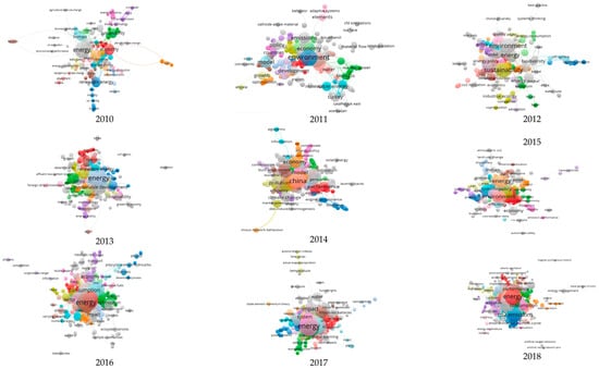 The following year, 2013, shows a similar structure to that of 2009, with a recovery of the concept of sustainable development. It is in this year that the green economy had greater presence in the research scenario, including terms, such as recycling or energy efficiency. 2014 stands out for the high prominence that China acquires in the investigation on 3E. The concept of environment is at the same level, to the detriment of energy and economy. Sustainability and energy efficiency also have a high presence, and it is at this time that solar energy is analysed to a greater extent. In that year, there was a distancing of the concept of economy in relation to energy and the environment, which had a greater presence in the research landscape than the first. In fact, the greatest division takes place between economy and energy, with the environment being the connecting element. China continues to have a high presence, as well as a growing number of articles analysing the uncertainty, performance, and management of energy efficiency.