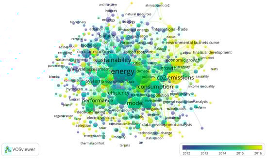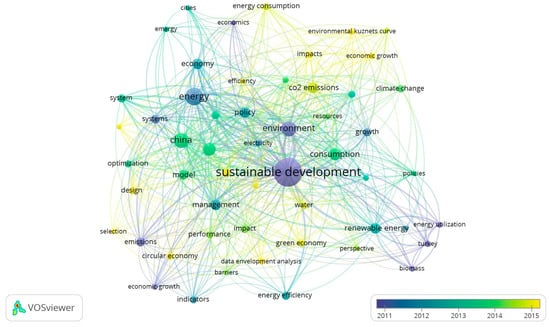 Figure 8 shows the latest trends in research with the integration of energy, economy, and environment terms in a single cluster analysis. An initial reflection in these trends indicates that the Kuznets environmental curve is used under the sustainable development approach. Currently, the enveloping analysis of data is used to study the impact of variables, such as carbon dioxide emissions or energy consumption on economic growth. On the other hand, due to the absence of some terms that were commonly used in previous years, such as petrol, pollution, or even some that are lagging behind, such as climate change, which is in accordance with this cluster analysis, future research on 3E may emphasise on Circular Economy and Green Economy as the main solution for achieving sustainable development.