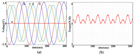 To verify the correctness and validity of the torque ripple compensation method, the two-phase fault-tolerant AC scheme, which has larger torque ripple, is compensated. The current laws satisfies Equation (33), where k1 = 1.1756 and k2 = –0.61. The current and torque waveform simulated by the finite element method in Figure 11 shows the current and torque waveform of the torque ripple compensation method based on the normal decoupled AC open-phase fault-tolerant algorithm, in which the current fault-tolerant control law satisfies Equation (33). (a) shows that the fault-tolerant current is no longer a pure sinusoidal current. (b) shows that the torque compensation strategy can completely and effectively suppress the torque ripple caused by the third harmonic magnetic potential. The simulation verifies the correctness and effectiveness of the fault-tolerant torque compensation.
