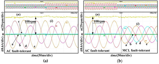 Figure 13 shows the current and speed waveforms of two open-phase fault-tolerant controls: (a) shows the fault-tolerant current after switching from single open-phase to two open-phase fault-tolerant; (b) is the waveforms after switching from the AC phase fault-tolerance to the A phase fault-tolerance, which shows that the speed transition is stable in the switching process; (c) shows the switching process from normal state to AB fault-tolerant by directly disconnecting A and B phases under normal operation. The two adjacent open-phase condition has the worst performance that the maximum load will have. In Figure 13, there were current spikes during the switching process, but no major speed fluctuations were observed, which shows the correctness of the two open-phases fault-tolerant strategy.