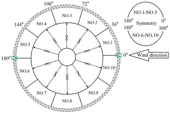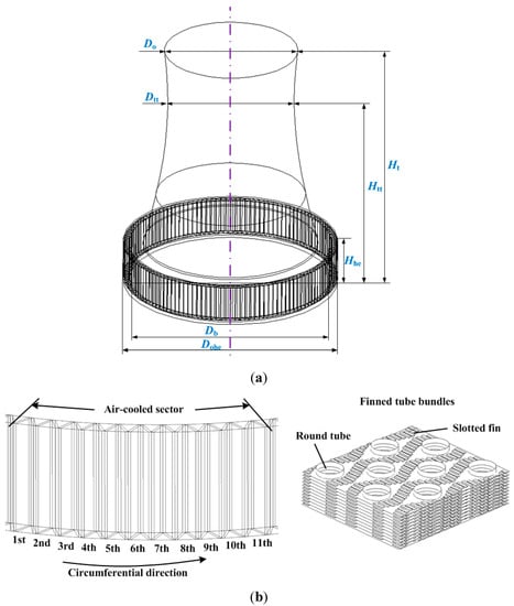 In power plants, the NDDCS incorporates a concrete hyperbolic dry-cooling tower and a large-scale air-cooled heat exchanger around the circumference of the tower base, as shown in Figure 1a. As for the large-scale air-cooled heat exchanger model in this research, it consists of 110 vertically arranged delta-type cooling units, which are divided into 10 air-cooled sectors, so as to distribute the circulating water feasibly, so that each sector comprises 11 cooling deltas as shown in Figure 1b. In practical engineering, the slotted finned tube bundles, which constitute the cooling deltas, are commonly adopted, due to the enhanced convective heat transfer, compared with the plain ones [19]. Furthermore, Table 1 lists the geometric parameters of the dry-cooling tower and slotted finned tube bundles.