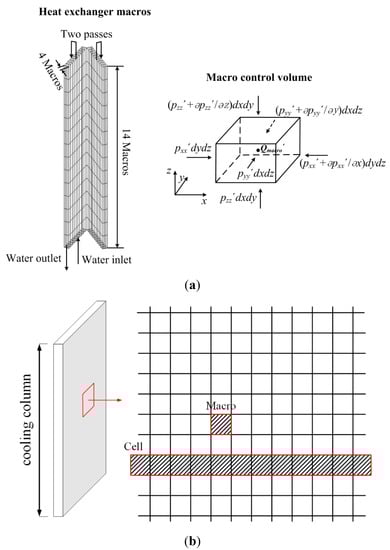 Schematic of control volume unit of heat exchanger. (a) Macro and cell control volume, (b) detailed micro and cell unit.