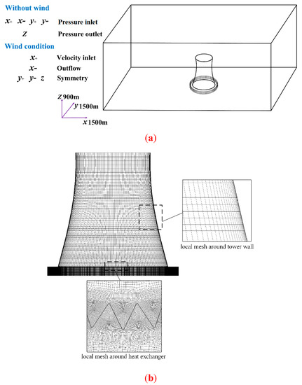 The cooling heat exchanger and the tower shell were modeled and computed in this work, as shown in Figure 4a. Table 2 shows the boundary settings used in this model. For the far-field boundaries, including the windward, top and leeward surfaces, the turbulence level of airflow field was quite low, and the turbulence intensity and viscosity ratios could be roughly set as 0.1% and 0.1, respectively [23,24]. During windy conditions, the crosswind velocity profile at the windward surface obeys the power law below, and imports a computational model by the UDF (user-defined function) [3,4,5,6,8,9]: