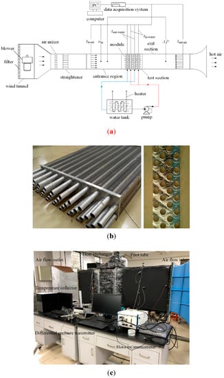 To obtain f and εmacro, an experimental analysis of flow and heat transfer performance for a four-row staggered slotted finned tube heat exchanger was carried out, using the thermal state experimental tunnel system presented here. A schematic diagram of the experimental system and the photos of the experimental facilities are shown in Figure 5. The wind tunnel has a test section that is covered by an asbestos layer, to minimize heat losses, which closely matched the experimental sample, to eliminate contraction and expansion losses. The staggered configuration is characterized by transverse and longitudinal pitches of 35 mm, a diameter of 35 mm, a fin spacing of 3.2 mm, and a fin thickness of 0.3 mm, with the tubes and fins of the heat exchanger are made from aluminum. The test section size is 400 mm in width, 700 mm in height, and 1000 mm long. In the air loop, the flow rate was controlled by a digital blower speed controller that was able to provide a windward air velocity of between 0.5 and 5 m/s, which was adjusted based on a hotwire anemometer with a precision of ±0.05 m/s. Two strings of L-type Pitot tubes were implanted upstream and downstream of the exchanger, to measure the pressure drop along the test section, using an inclined single tube microdifferential pressure gauge with a precision of ±0.15 Pa. Two fine metal grids were placed in the inlet (12 T-type thermocouples) and outlet (16 T-type thermocouples) of the test section.