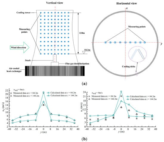 To evaluate the modeling and numerical methods, flow performance experiment of the scale model for an NDDCS was carried out, and the measurement point schematic design is shown in Figure 6a. Wind speeds are measured by a hot-wire anemometer, IFA-300, with an accuracy of ±0.1%, and 108 measuring points were placed inside the cooling tower far from the main structures, with 12 layers in the z direction and nine columns in the y direction. Moreover, the vertical and horizontal intervals between measuring points were 10 m and 9 m for the model tower, respectively. Both the results were processed and output by the data acquisition unit and computer, and the experimental uncertainties of the measured rising velocity were about 0.6% [25].