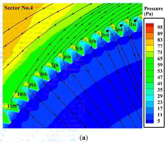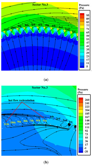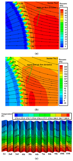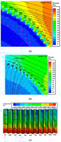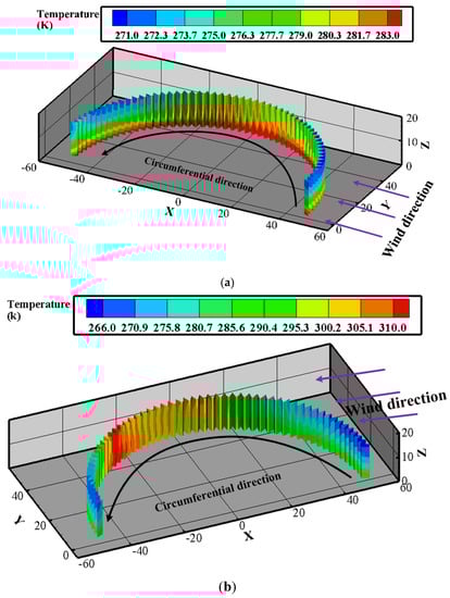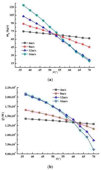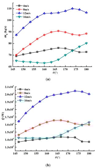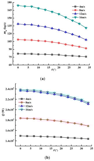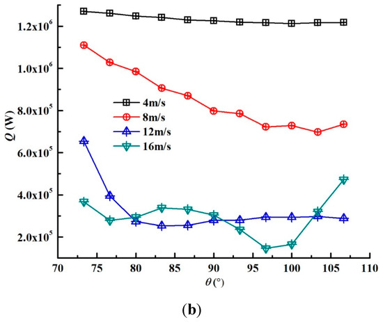 For the frontal cooling deltas, Figure 8 presents a much higher pressure difference and air temperature differences at high wind speeds, so that the air mass flow rate and heat rejection appear to be larger at a high wind speed, as shown in Figure 9. However, due to the aggravated air flow deviation at the high wind speed, the air mass flow rate reduces more conspicuously along the circumferential angle at the strong crosswind, which then results in a sharper heat rejection drop, as observed in Figure 9b.