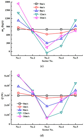 With the macro heat exchanger model, the 3D overall outlet air temperatures of the large scale air-cooled exchanger of NDDCS can be presented, which are shown in Figure 7a,b at a typical small wind speed of 4 m/s and a high wind speed of 12 m/s. As can be seen, the global visions varied quite significantly from each other. Meanwhile, Figure 7c,d quantitatively shows the air mass flow rate and heat rejection of the five air-cooled sectors at various wind speeds. As observed, the air mass flow rate and heat rejection both increased for the frontal sector No.1, as the wind speed increases. While for the middle front sector No.2, it shows the small thermo-flow differences at various wind speeds. However, for the middle sector No.3, as well as the middle rear sector No.4, the air mass flow rate and heat rejection both changed greatly with the wind speed, and the most deteriorated thermo-flow performances appeared at a wind speed of 12 m/s for the two sectors. As for the leeward sector No.5, the maximum air mass flow rate and heat rejection could be seen at a wind speed of 12 m/s; additionally, although the air mass flow rate was almost the smallest at a wind speed of 16 m/s, the heat rejection was still maintained at an intermediate level.