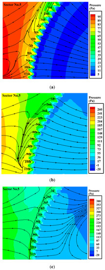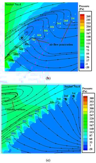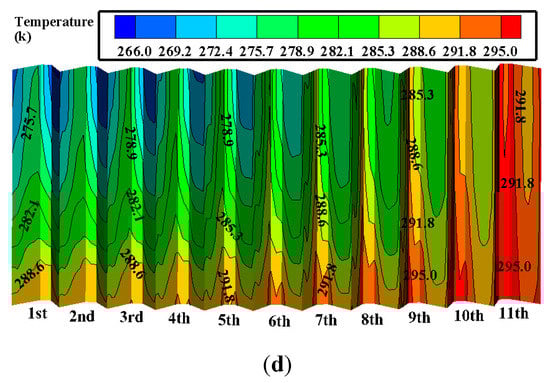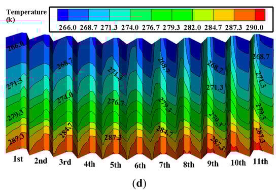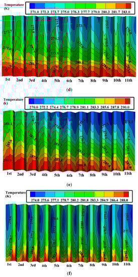 For the middle-rear deltas, it can be seen from Figure 14a that the air changed from a perpendicular direction to flow through the finned tube bundles at a small wind speed of 4 m/s, due to the recovered pressure differences. In contrast, at a high wind speed of 12 m/s, air flow penetration appeared for the first to the seventh deltas, resulting from the reversed pressure difference between the inlets and outlets of the finned tube bundles, as shown in Figure 14b. However, for the eighth to 11th deltas, the improved flow field could be observed, due to the positive pressure differences. At a high wind speed of 16 m/s (Figure 14c), the outside vortices can be seen near the downward sixth to 11th cooling deltas. In Figure 14d, the disordered high outlet air temperature region contracts gradually for the 11 cooling deltas at the small wind speed of 4 m/s. While at a high wind speed of 12 m/s, the extremely high outlet temperature is largely distributed for the first to seventh cooling deltas, which do not recover until the last four deltas, as shown in Figure 14e. At a high wind speed of 16 m/s (Figure 14f), the last six cooling deltas have a smaller high outlet air temperature area than those of the first five deltas. On the whole, most of the cooling deltas have the highest air mass flow rates at a wind speed of 4 m/s, whereas the lowest values occur at 12 m/s, as shown in Figure 15. Correspondingly, for the first cooling delta, the highest degree of heat rejection appears at a small wind speed of 4 m/s, however, for the last sixth to 11th cooling deltas, the maximum values are presented at a high wind speed of 16 m/s, due to the intensified heat transfer effects from the outside vortices.