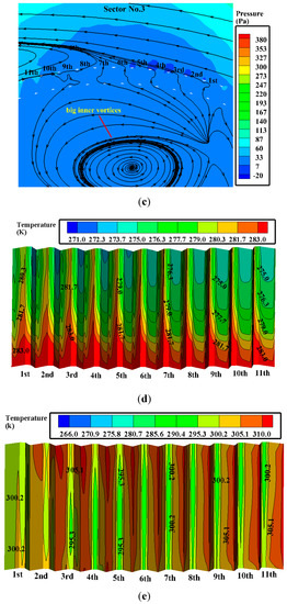 Variable fields of the leeward deltas. (a) Pressure and flow fields at 4 m/s, (b) pressure and flow fields at 12 m/s, (c) pressure and flow fields at 16 m/s, (d) outlet air temperature at 4 m/s, (e) outlet air temperature at 12 m/s, (f) outlet air temperature at 16 m/s.