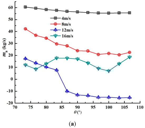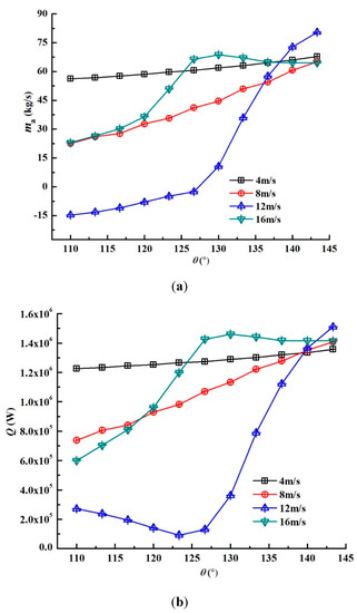 For the middle cooling deltas, the cooling air flows almost tangentially at a low wind speed of 4 m/s, while hot flow recirculation is produced, even at the high wind speeds of 12 m/s and 16 m/s; besides, big inner vortices are observed at 16 m/s, as shown in Figure 12a–c. As a result, from Figure 12d–f, it can be seen that the outlet air temperature is extremely high and disordered at the high wind speeds of 12 m/s and 16 m/s. In such a case, the air mass flow rate and the present heat rejections are obviously lower at the higher wind speeds, as shown in Figure 13. It was also noted that the fifth to 11th cooling deltas had negative air mass flow rates at a wind speed of 12 m/s, due to hot flow recirculation.