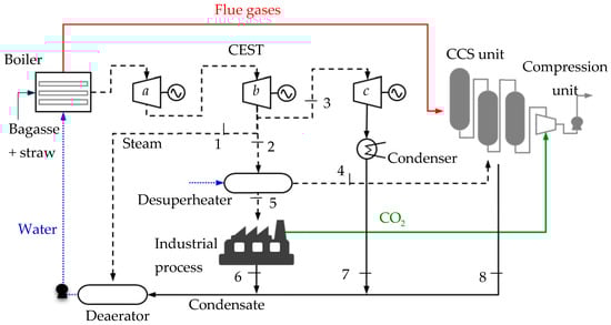Figure 1 shows the process flow diagram that represents the operation in the harvest season (i.e., with steam extraction for industrial process), with CCS. In software’s basic configuration the steam turbine has three bodies. The steam flow to the deaerator (stream 1) corresponds to 2% of the steam raised and is extracted from the turbine body b. The stream (2) feeds the industrial process (stream 5) and the heat exchanger for regenerating the solvent (stream 4), being its thermodynamic state adjusted (in a desuperheater) to the required temperature (137 °C). Streams (6), (7) and (8) refer to condensates, being assumed 90% recovery of streams (6) and (8), but both at 90 °C; pumps for setting the pressure of condensing flows before the deaerator are omitted in Figure 1.