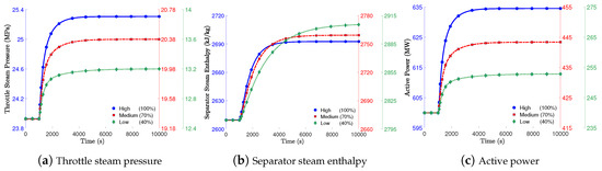 In the derived model, the manipulate variables are the fuel flow rate command (, kg/s), feedwater flow rate (, kg/s), and turbine throttle valve opening (, %); the controlled variables are the throttle steam pressure (, MPa), separator steam enthalpy (, kJ/kg), and active electric power generated by the turbogenerator (, MW), respectively. Some typical operating conditions are shown in Table 1.